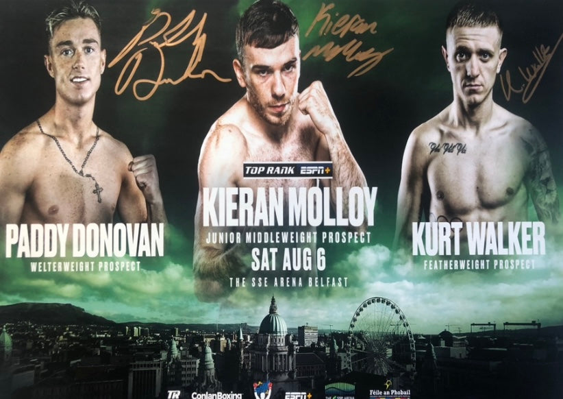 This signed 16x12 inch photo features 3 Irish boxers: Paddy Donovan, Kieran Molloy, and Kurt Walker. With authentic signatures, this photo is a must-have for any boxing enthusiast or collector. Perfect for display or as a unique gift, it adds a touch of Irish pride to any room.